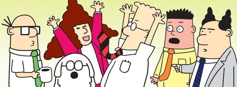 As a child of the 90s, I grew up reading Dilbert. The world-famous comic was my introduction to the corporate world, and I had been laughing over it from long before I was old enough and aware enough to even understand half the concepts, let alone to have any experience of corporate life. For me, Dilbert has always been there as a tentpole of my imaginative landscape. Characters, lines, and images from the strip serve as reference points in my brain to this very day (“You need a new kybard? What’s a kybard?” “JUST SIGN THE STUPID THING!”). A great deal of my own sense of humor was formed by the dry, sarcastic wit of the Dilbert cast.